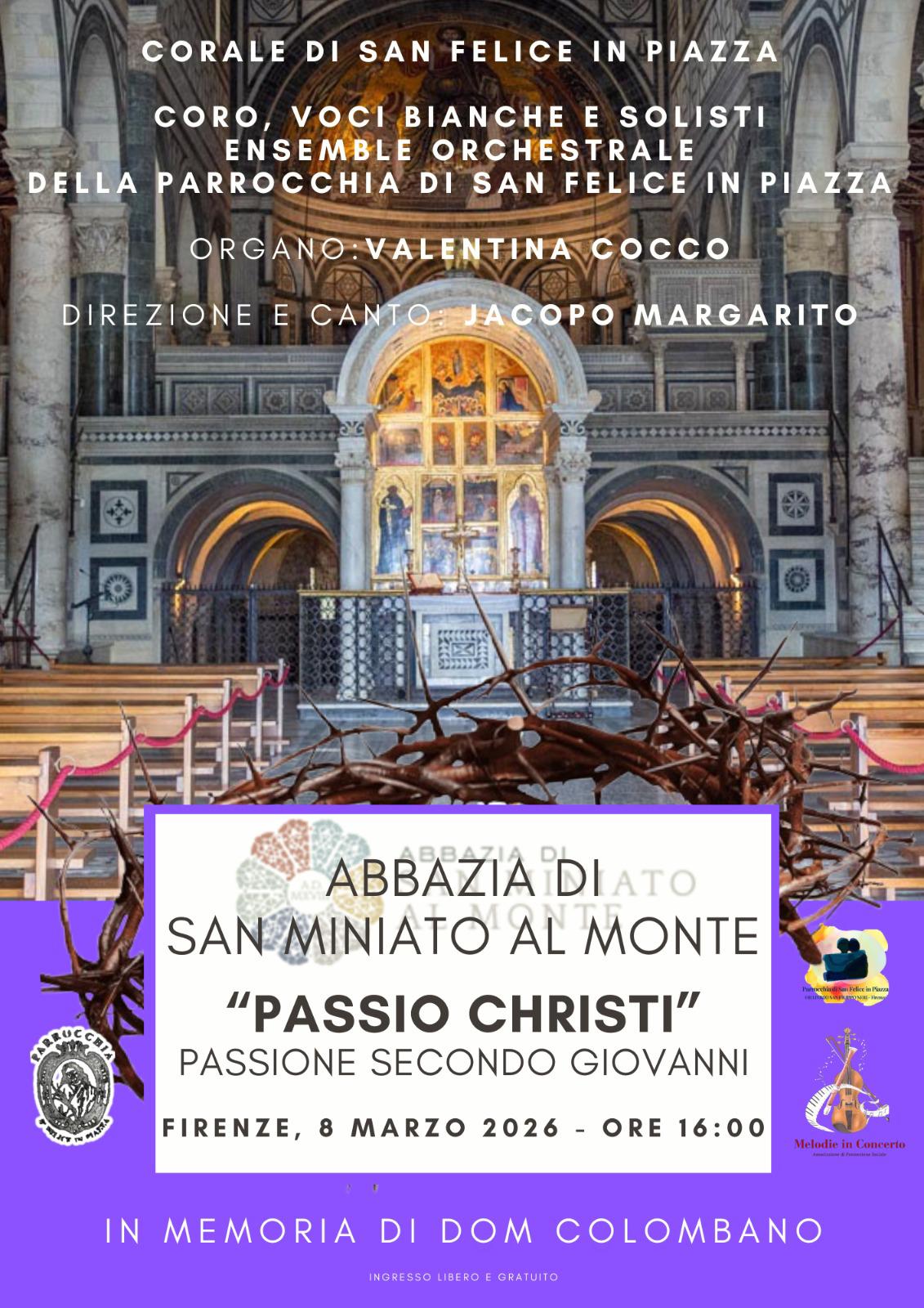 Domenica 8 marzo 2026, ore 16: «Passio Christi». Concerto vocale in memoria di Dom Colombano Maria eseguito dalla Corale di San Felice in Piazza diretta da Jacopo Margarito
