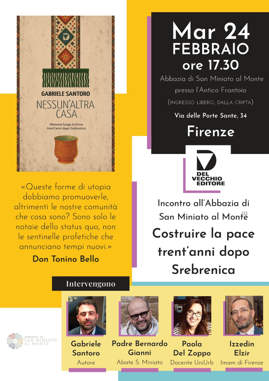 Martedì 24 febbraio 2026, ore 17.30: «Costruire la pace trent’anni dopo Srebrenica». Intervengono Paola Del Zoppo, Izzedin Elzir, padre Bernardo e Gabriele Santoro, autore del volume «Nessun’altra casa. Memorie lungo la Drina»