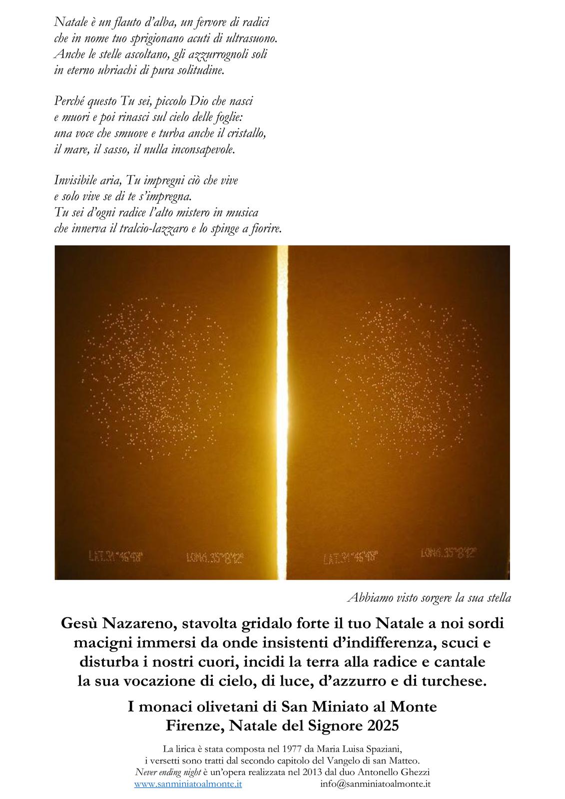 «Tu sei d’ogni radice l’alto mistero in musica / che innerva il tralcio-lazzaro e lo spinge a fiorire»: una lirica natalizia di Maria Luisa Spaziani e un’opera del duo Antonello Ghezzi sono gli auguri da San Miniato al Monte per la Natività del Signore 2025